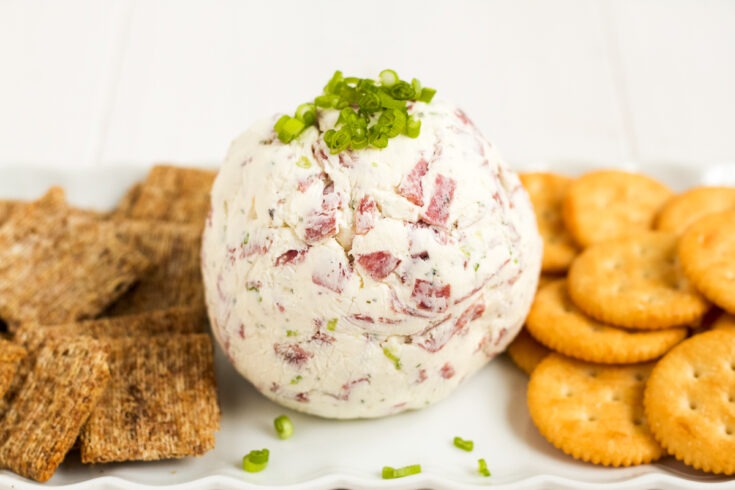 - To serve, unwrap the cheese ball, put it on a serving plate, top it with the darker green parts of the chopped green onion, and serve with crackers or baguette slices.